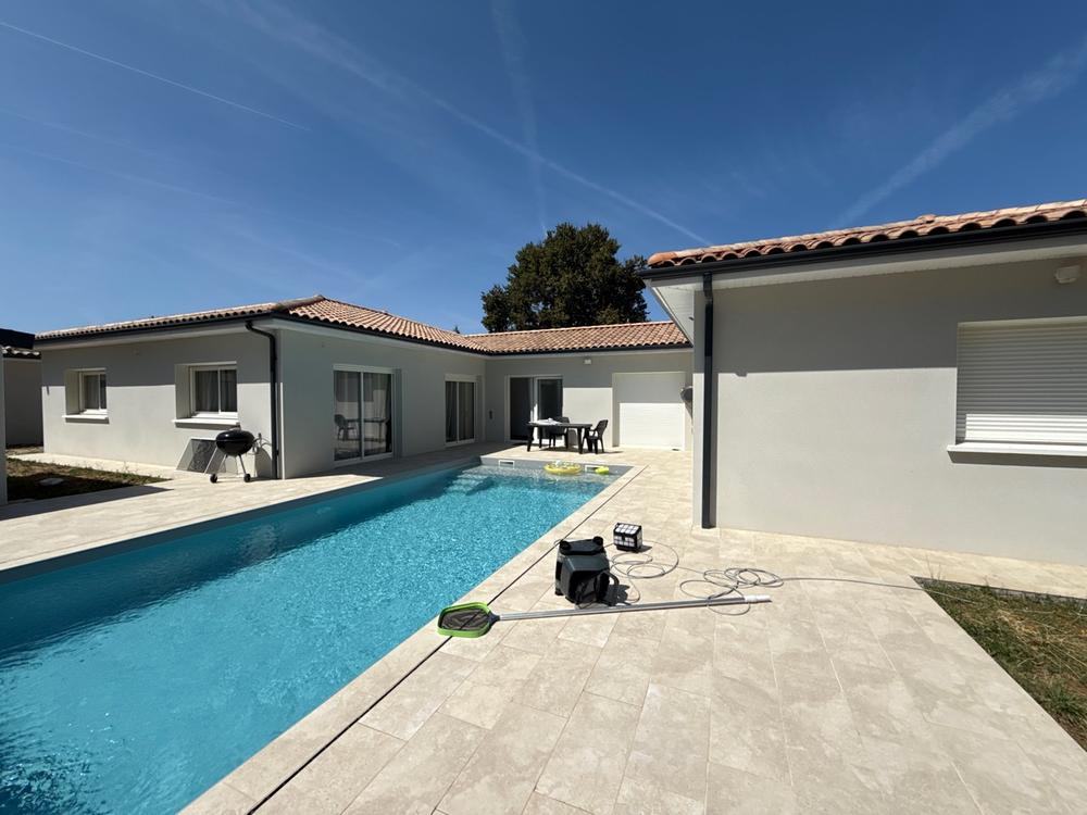 À l'extérieur, vous profiterez d'une grande terrasse autour de la piscine (9x4) avec volet immergé, d'une cuisine d'été et d'un garage avec coin bureau et salle d'eau.